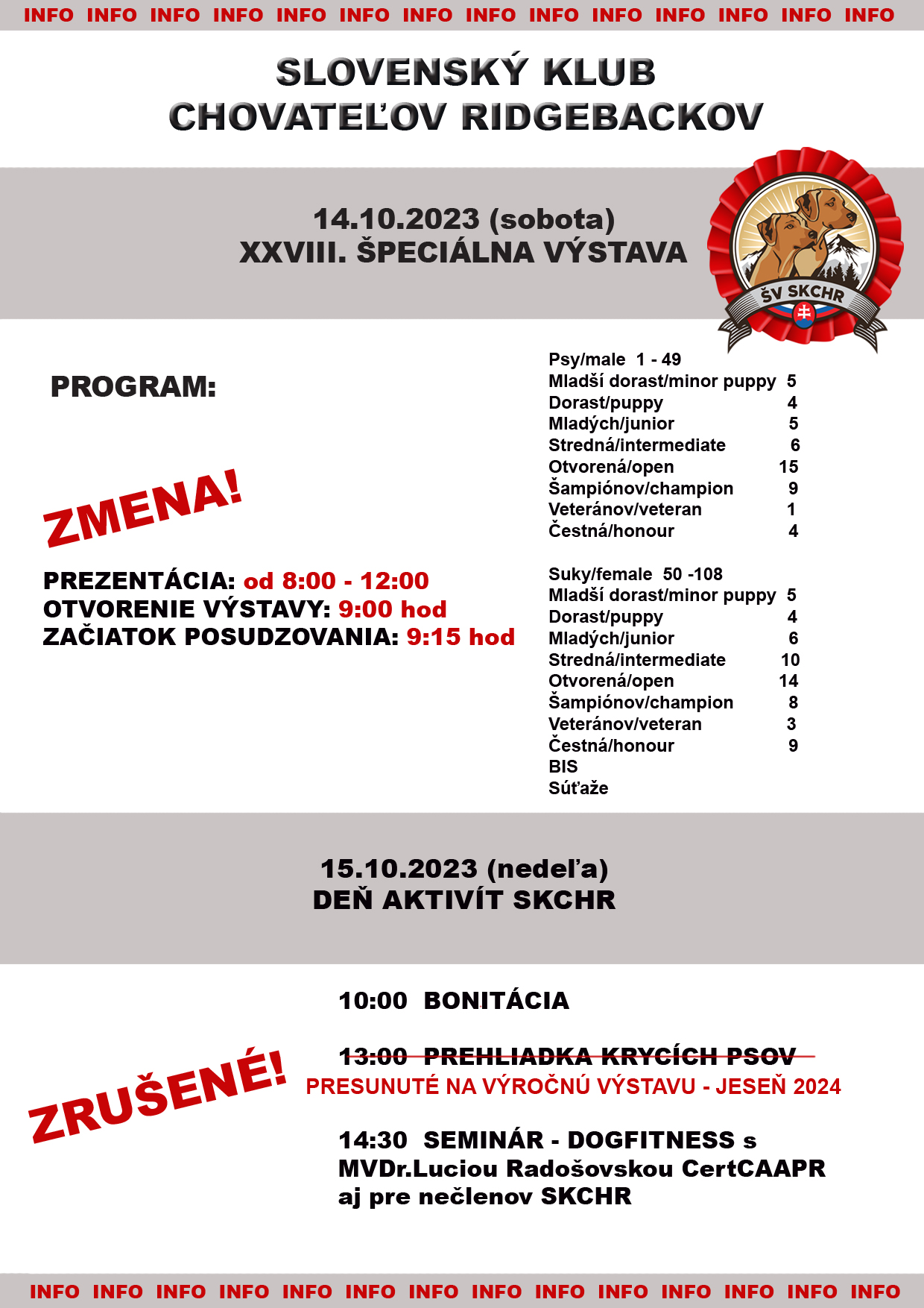 Upozorňujeme vystavovateľov, že poradie posudzovania tried na výstave bude prebiehať rovnako ako na ostatných výstavách, t.j. začíname triedou mladšieho dorastu - psy a končíme triedou čestnou - suky. Po ukončení posudzovania sa budú konať súťaže.
