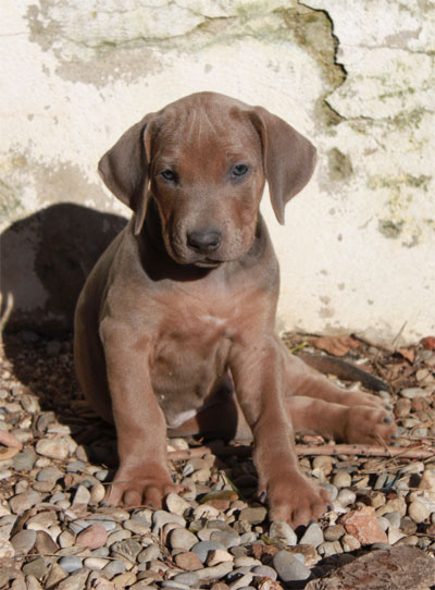 Novorodené šteňatá možno ľahko rozpoznať, pretože ukazujú charakteristické pigmentácie fenotyp. Farby srsti majú svetlejší odtieň ako ostatné šťeňatá. Narodia sa s odtieňom veľmi striebornej alebo sivastej, ale stále majú aj čiastočne červené farbivo v ich srsti, ako keby boli posypané červenou púdrom. Majú krásne modré oči, ktoré môžu zostať modro-sivé alebo jantárové, čo som videla v tomto prípade u RR. Ich koža na nose teda nie priamo nos, ale partia nad nosom smerom k stopu a aj nechty sú sivé, nie čierne. Dospievaním sa táto ich šedá farba postupne mení a stáva menej šedou - vytráca sa. Toto sfarbenie je u plemena Rhodesian Ridgeback neštandardné.